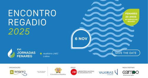 XVI Jornada FENAREG | Encontro do Regadio 2025 A FENAREG – Federação Nacional de Regantes de Portugal está a organizar o Encontro do Regadio 2025 - XVI Jornada da FENAREG, este ano integrado nas comemorações dos 20 anos da FENAREG ao serviço do regadio. O evento irá decorrer no dia 06 de novembro, no Auditório do LNEC, em Lisboa. Esta edição terá como foco três temas centrais que definem o futuro do setor e de suporte à modernização e competitividade do regadio: a Estratégia “Água que Une”, enquanto estratégia de gestão integrada e de financiamento do regadio ate 2030; a Estratégia de Resiliência Hídrica; e a Política Agrícola Comum (PAC). |