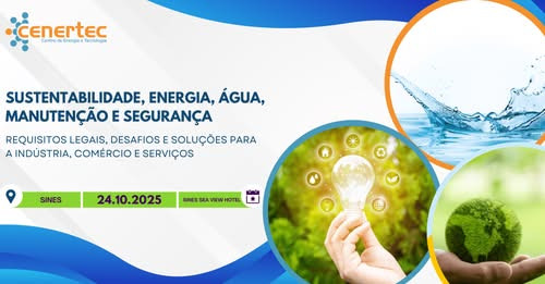 Sustentabilidade, Energia, Água, Manutenção e Segurança O Evento "Sustentabilidade, Energia, Água, Manutenção e Segurança - Requisitos Legais, Desafios e Soluções para a Indústria, Comércio e Serviços", vai ter lugar em Sines, no dia 24 de Outubro, de manhã, no Sines Sea View Hotel. A inscrição é gratuita, com número de lugares limitados. Por favor faça o seu registo, até ao dia 15 de Outubro.