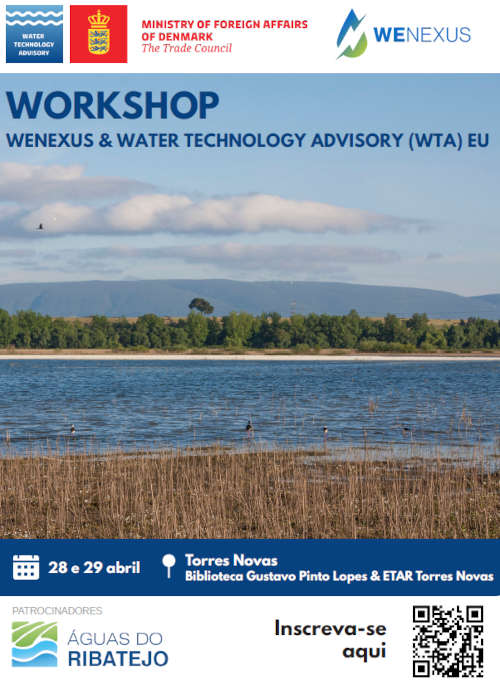 Workshop Técnico - Transição Energética no Setor da Água O workshop: “Transição energética no setor da água: conhecimento, casos práticos e soluções de eficiência aplicadas a infraestruturas”, a realizar-se nos dias 28 e 29 de abril de 2026, em Torres Novas, na Biblioteca Gustavo Pinto Lopes e na ETAR de Torres Novas, é organizado no quadro do projeto WENexus, com o apoio da Embaixada da Dinamarca e das Águas do Ribatejo. O link para inscrição é: ficha de inscrição.
