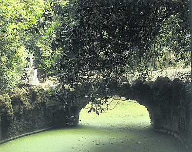 Construção em forma de gruta construída essencialmente em alvenaria de pedra revestida a tufo ou travertinão calcário. Os pilares que a compõe suportam um terraço pavimentado parcialmente arborizado. Dispõe de vários percursos de circulação interior, dos quais se destaca o longo deambulatório que rodeia um lago parcialmente subterrâneo, acedendo-lhe por cinco entradas a alturas diferentes. |